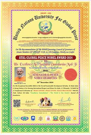Hon’ble Prime Minister Of India Shri Narendra Modi Jii is Honoured with ” ATAL GLOBAL PEACE NOBEL AWARD 2024″ from His Eminence Prof. Dr. Madhu Krishan , Eminent Scientist, The Chairman cum Chief Rector of AUGP, USA .