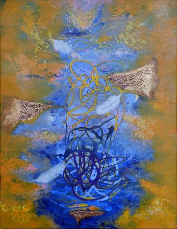 In her works, blue is not a backdrop to devotion but a spatial field in which matter, energy, and consciousness appear suspended. The paintings move between vortex and void, between cellular intricacy and cosmic scale. Spirals open like primordial galaxies. Orb-like forms hover as if embryonic worlds. Vein-like calligraphic tracings pulse across surfaces, suggesting neural networks, river deltas, or unseen cosmological diagrams. The language is abstract, yet unmistakably organic.